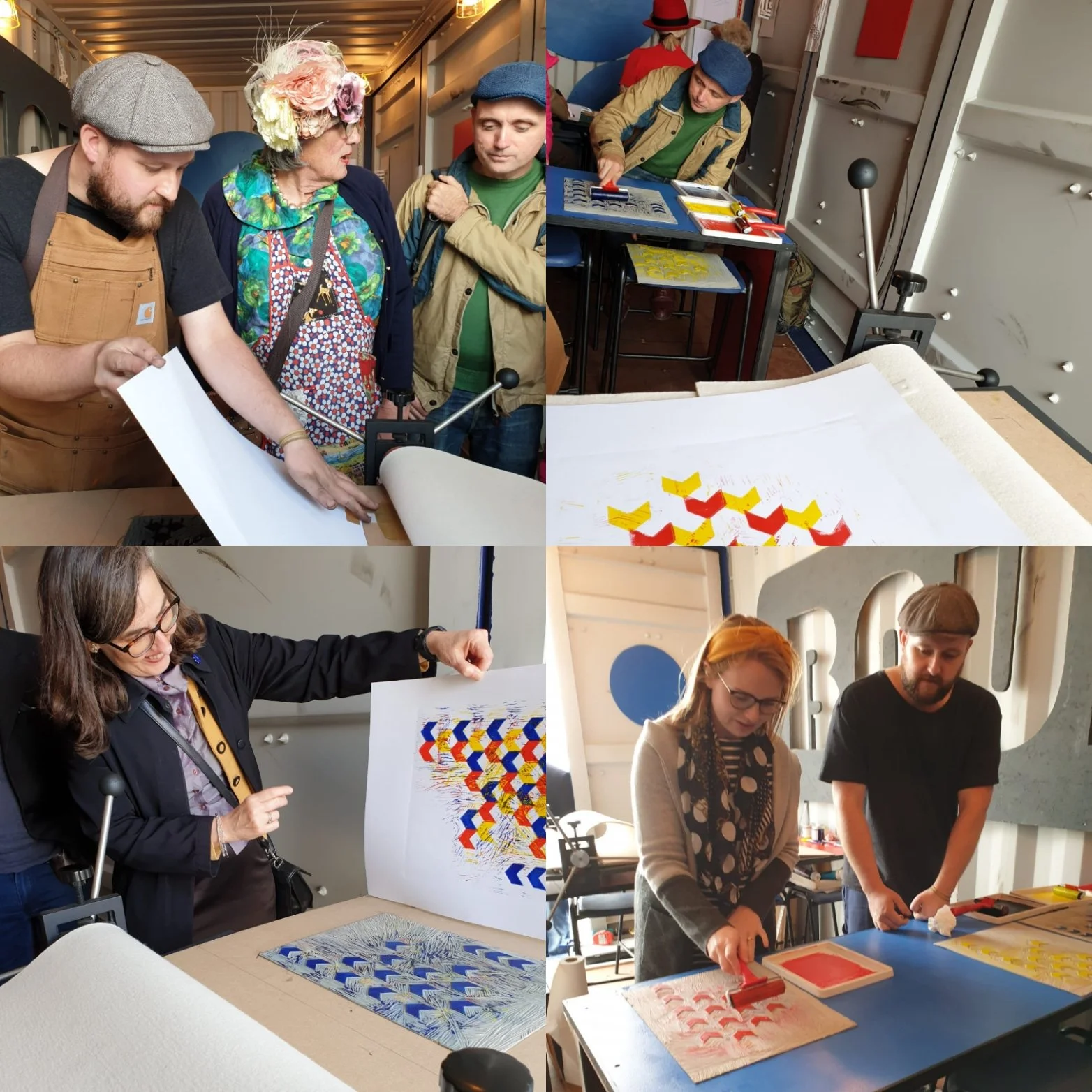 Deco PubliqueAmbitious four-colour linocut poster design for Bauhaus themed workshop, collaboratively printed.